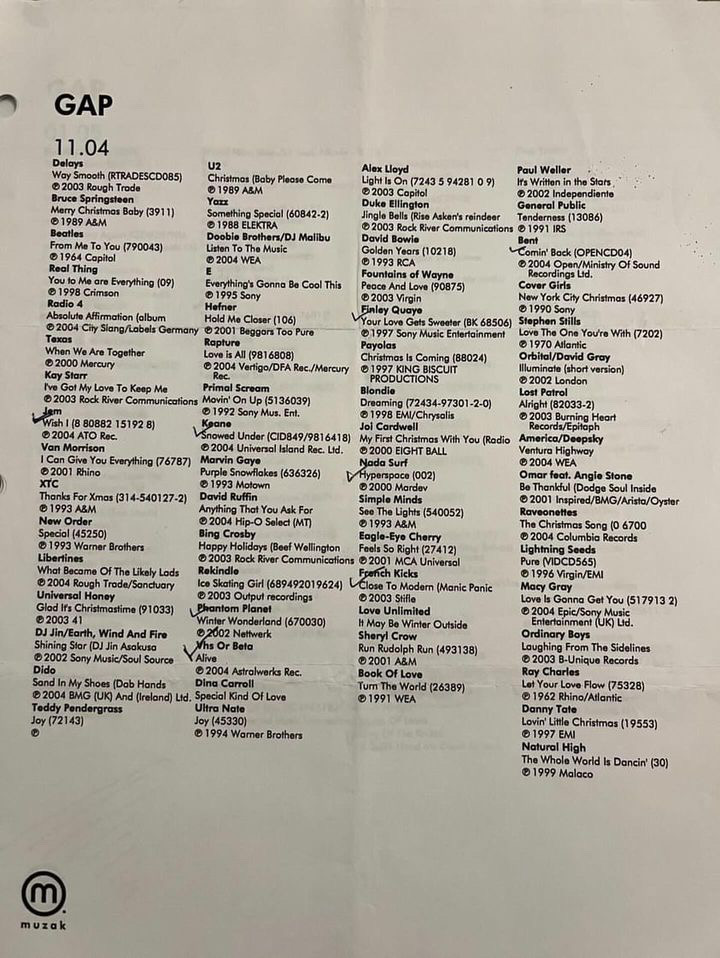 If you worked at Gap and saved any of the playlists that came with each month's CD/tape,